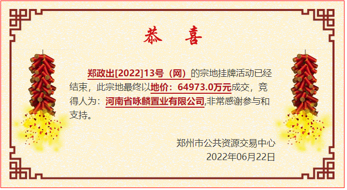 此地块由河南省咏麟置业有限公司以64973万元摘得,地价852万元/亩,折合楼面价4260元/㎡。