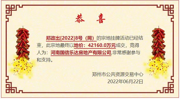 此地块由河南国信乐达房地产有限公司以42160万元摘得,地价1547万元/亩,折合楼面价4642元/㎡。