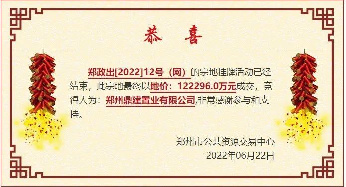 此地块由郑州鼎建置业有限公司以起始价122296万元摘得,地价1097万元/亩,折合楼面价4703元/㎡。