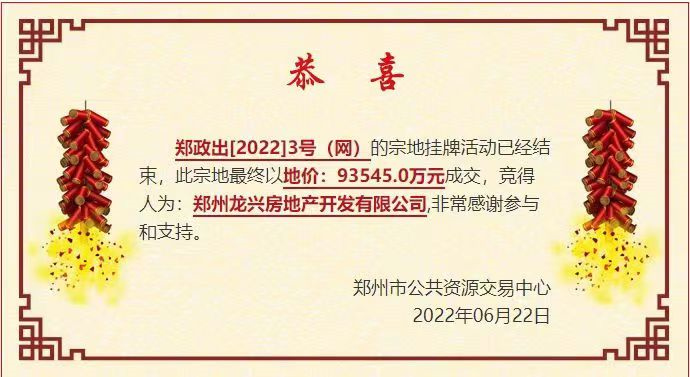 该地块最终郑州龙兴房地产开发有限公司(龙湖)以93545万元成交,溢价率12%,楼面价4812元 /㎡。