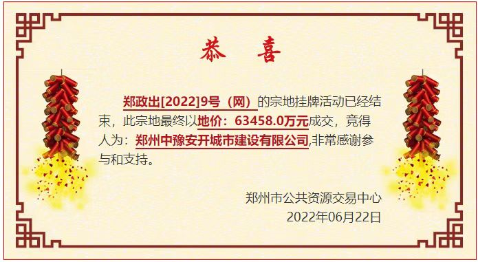 该地最终以起始价63458万元被郑州中豫安开城市建设有限公司摘得,地价为812万元/亩,折合楼面价4061元/㎡。