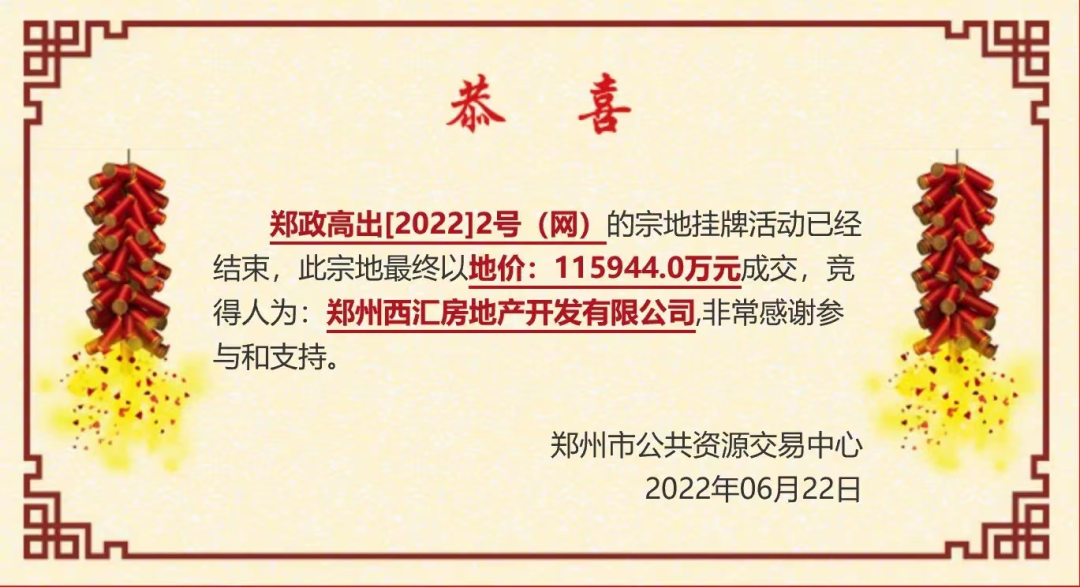 该地块由郑州西汇房地产开发有限公司以起始价115944万元摘得,楼面价4025元/㎡。
