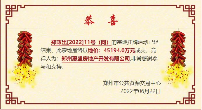 此地块由郑州惠盛房地产开发有限公司以45194万元摘得,地价592万元/亩,折合楼面价3060元/㎡。