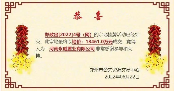 为管城区十八里河城中村改造项目,为永威城项目后期建设用地,该地块由河南永威置业有限公司以起始价18461万元摘得,地价894万元/亩,折合楼面价3831元/㎡。
