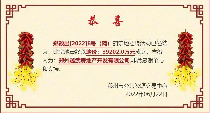此地块郑州越武房地产开发有限公司以起始价39202万元摘得6号土地,地价为1129万元/亩,折合楼面价4839元/㎡。