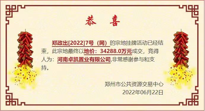 该地最终被河南卓凯置业有限公司以34288万元摘得,地价1098万元/亩,折合楼面价4706元/㎡。