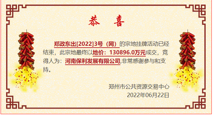 该地最终以130896万元被河南保利发展有限公司摘得,溢价8%,地价为2342万元/亩,折合楼面价20663元/㎡。