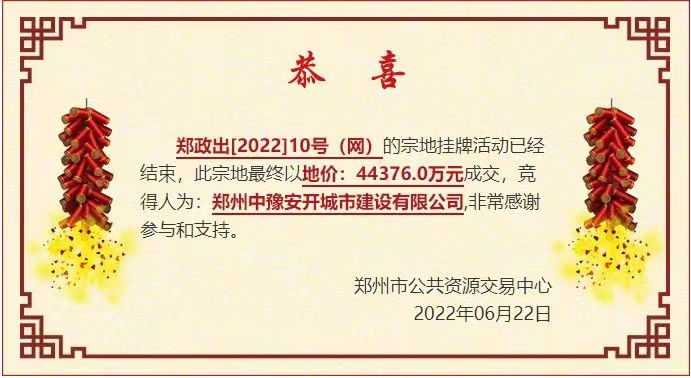 此地块由郑州中豫安开城市建设有限公司以起始价44376万元摘得,地价850万元/亩,折合楼面价3270元/㎡。