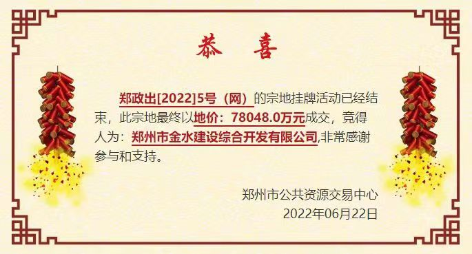 此地块由郑州市金水建设综合开发有限公司以起始价78048万元摘得,地价为1125万元/亩,折合楼面价4822