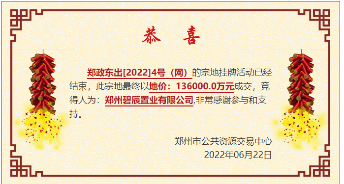 该地块最终以136000万元被郑州碧辰置业有限公司摘得,地价为1486万元/亩,折合楼面价12050元/㎡。