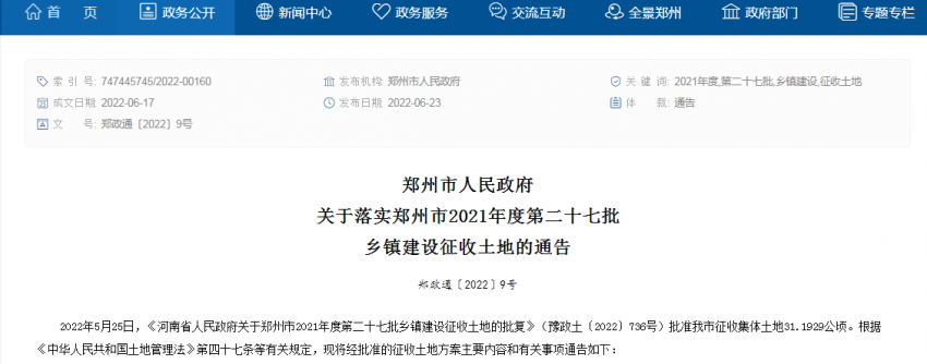 郑州市2021年度第二十七批乡镇建设征收土地。