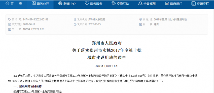 《河南省人民政府关于郑州市实施2017年度第十批城市建设用地的批复》(豫政土〔2022〕825号)文件批复,国务院已批准我市征收集体土地19.9077公顷(折合298.6155亩)。