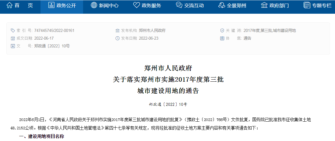 根据《河南省人民政府关于郑州市实施2017年度第三批城市建设用地的批复》(豫政土〔2022〕766号)文件批复,国务院已批准我市征收集体土地48.2152公顷(折合723.228亩)。