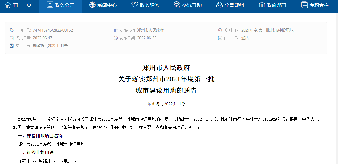 根据《河南省人民政府关于郑州市2021年度第一批城市建设用地的批复》(豫政土〔2022〕802号),批准我市征收集体土地31.1929公顷(折合467.8935亩)。