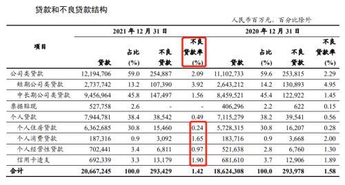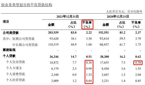 再来看不良数据。《通知》出台前商业银行对个人住房贷款的显著偏好并不是无条件的,与其资产质量密切相关。像建行副行长就在业绩会上公开表示过,个人按揭贷款等业务资产质量较好。这里以农行2021年各贷款业务的不良数据为例: