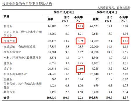 但比例依然有所下降,例如建行房地产贷款比例从4.11%下降到3.89%。而从不良率来看,房地产行业贷款的表现就没有个人住房贷款那么优质了,多家银行的不良率从2020年到2021年均有所上升。以农行为例,从1.81%上升到3.39%;再与其他行业进行对比,其不良率仅次于制造业和采矿业: