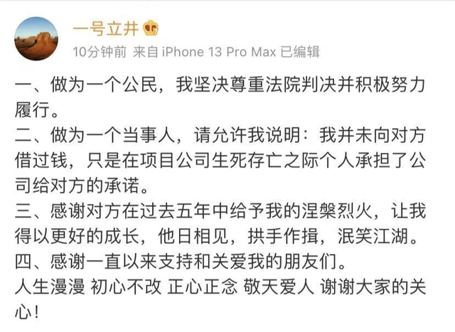 李亚鹏称他作为一个公民,将坚决支持法院的判决,积极努力履行!