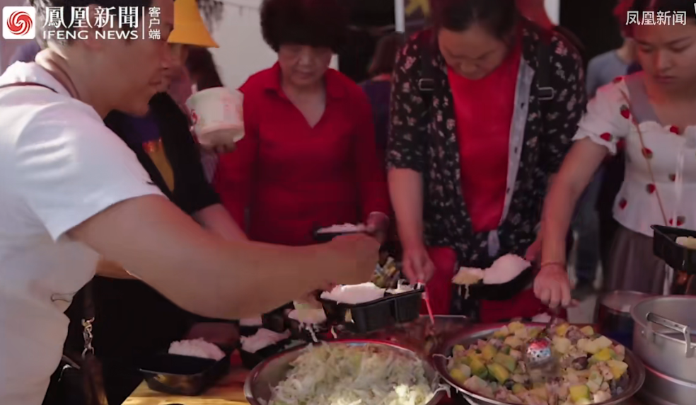 家里做不了饭,就在空地上支起炉灶做大锅饭。