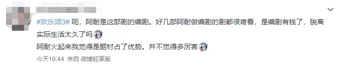 原本主创和剧情换血已经大幅降低了观众的期待值,剧集播出后,观众又发现剧情人设、演员演技均未达预期,吐槽《欢乐颂3》拍成小时代,直接触底。